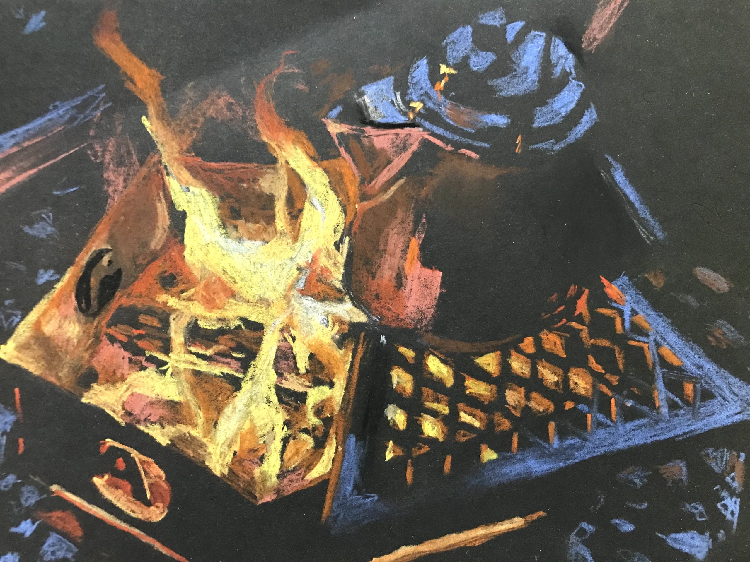 油彩が足し算でダイナミズムを表現する。それに対して、オイルパステルは元々濃厚なアートボードに優しい色を乗せる。重厚な色を引いていくことによってダイナミズムを表現します。